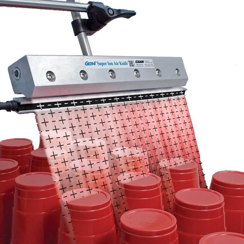 La Gen4® Cortina Super Ion Air Knife elimina la electricidad estática de plásticos, redes, papel y otras superficies de productos que puedan tener problemas de ruptura, obstrucción o descargas eléctricas. La lámina de aire barre la estática, partículas, polvo y suciedad de las superficies, permitiendo mejorar drásticamente la velocidad de producción, la calidad del producto y la limpieza de las superficies.