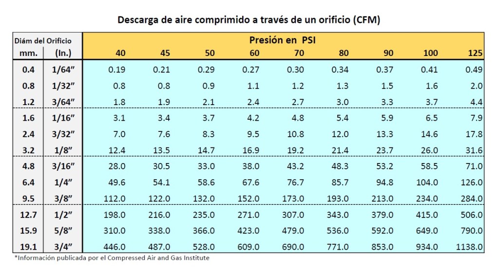 Cuando un sistema de aire comprimido opera a una presión por encima de lo necesario, no solamente se utiliza más energía en elevar la presión, sino que también los componentes finales y las fugas consumen mayor volumen de aire. En la tabla a continuación se puede apreciar esta relación. Úsela para calcular el consumo de aire en mangueras venteando, «flautas de aire» y fugas en la red de aire comprimido. Compárela con el consumo eficiente de boquillas y cuchillas de aire Exair diseñadas con alta ingeniería.